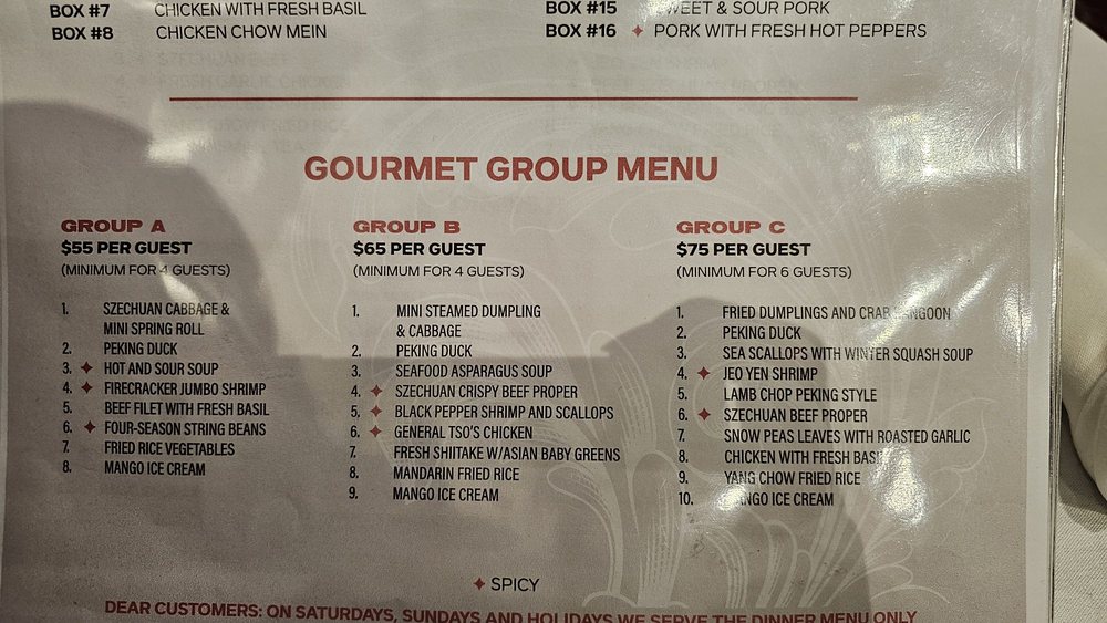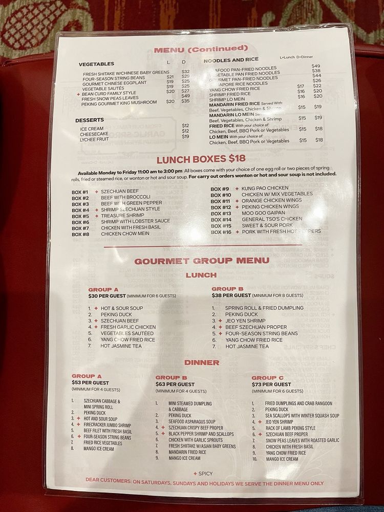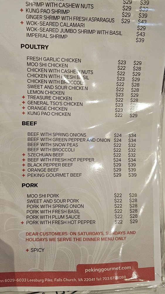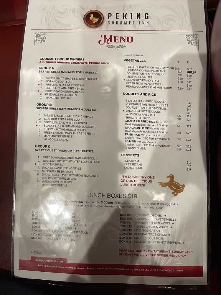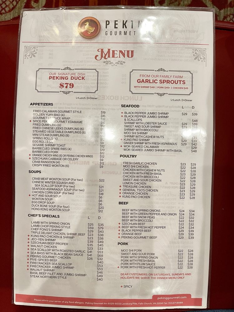 Introducing the menu at Peking Gourmet Inn, a Chinese restaurant located in Falls Church, VA. This restaurant offers a variety of amenities such as takeout, vegan and vegetarian options, Wi-Fi, and a full bar. Customers rave about the Peking duck, which is juicy, flavorful, and carved table side. The crispy beef, fried rice, and green beans are must-try dishes as well. While some customers mention the high prices, they praise the attentive service and delicious food. The ambiance is bustling, and reservations are recommended. Overall, Peking Gourmet Inn is a great spot for authentic Chinese cuisine and a memorable dining experience.